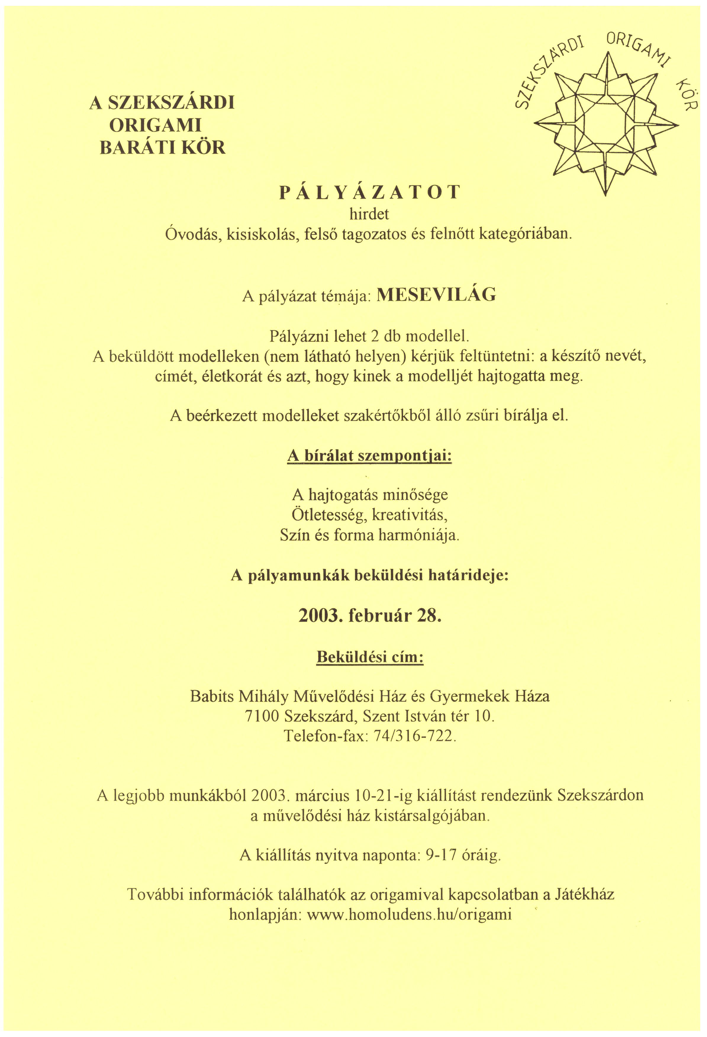 Origami pályázat - Mesevilág - 2003 | 2003. 02. 28. 19.00 |